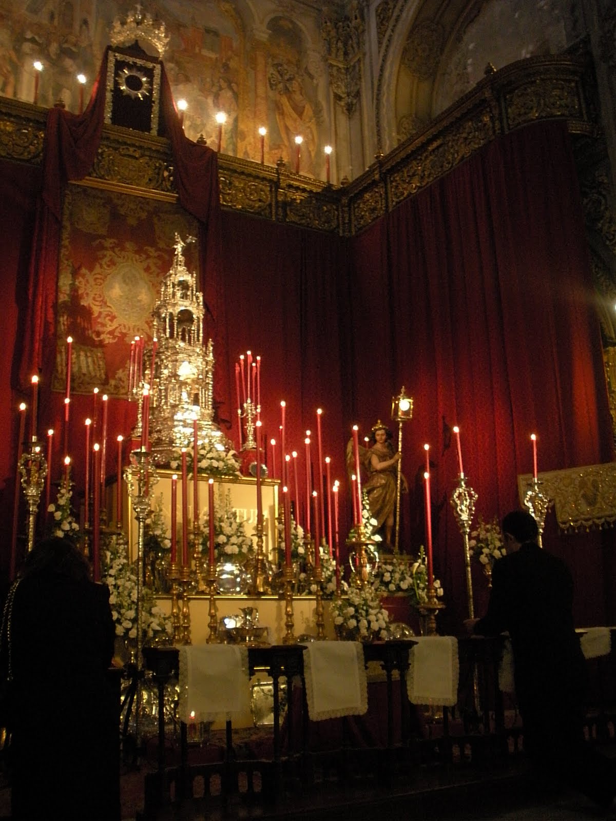 In observance of the symbolic death of Jesus, a rather baroque candlelight vigil was erected around the sealed tabernacle, which itself had been moved from its normal place behind the main alter. According to tradition, the tabernacle is then reopened Easter Sunday to reveal the resurrected "body of Christ."